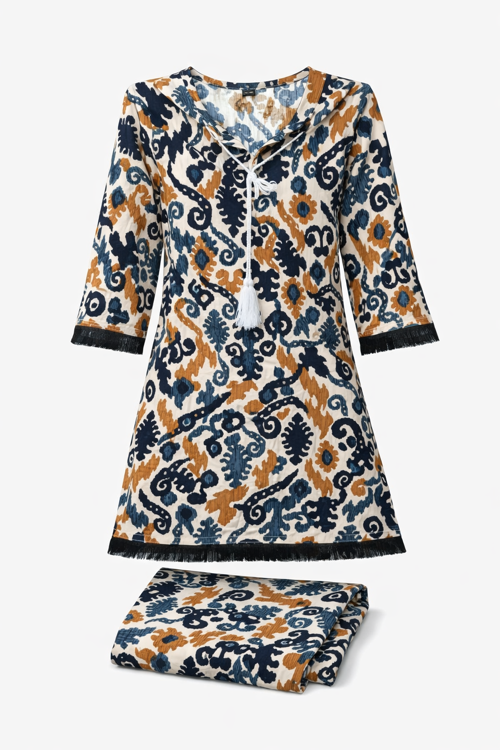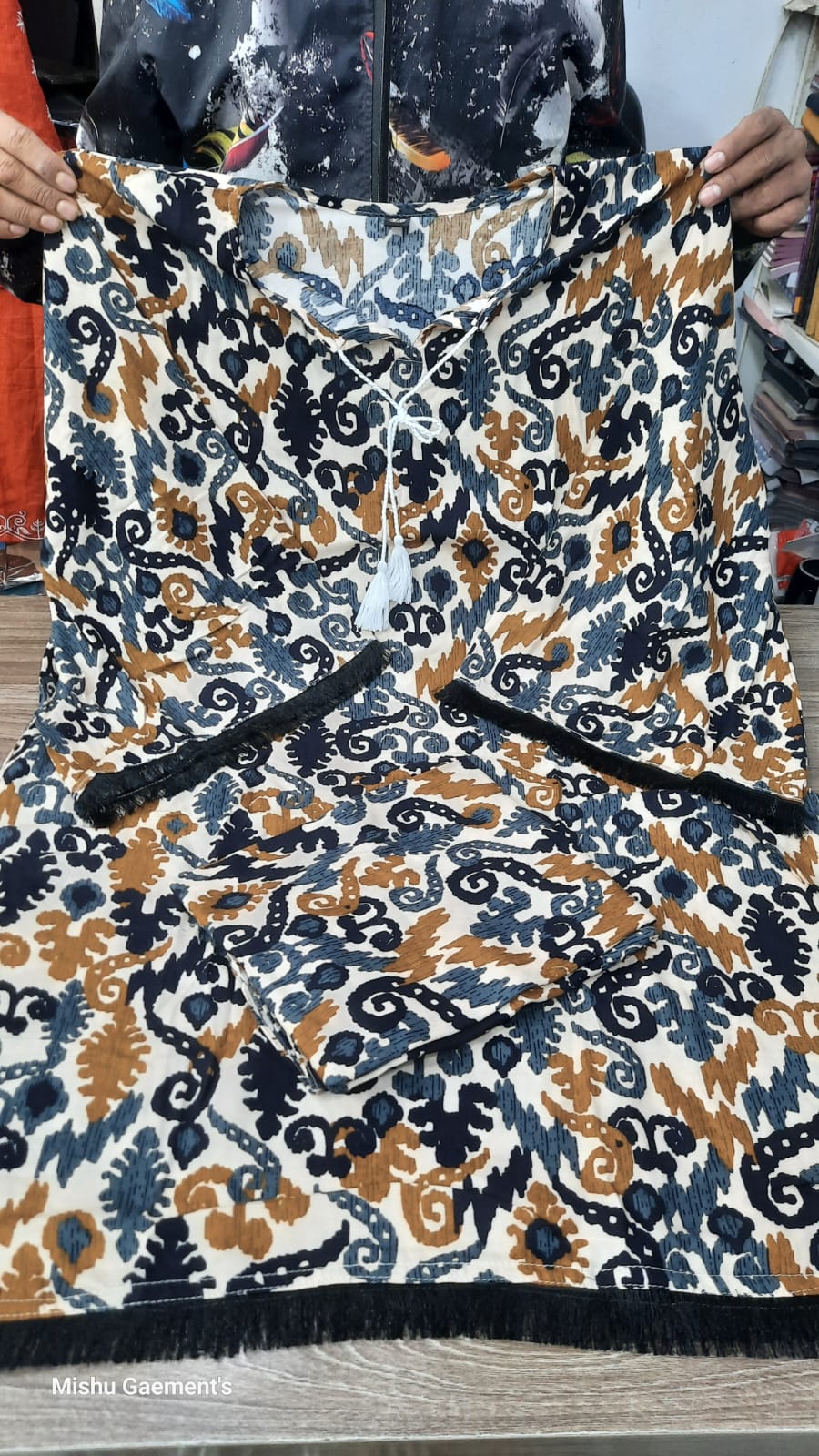 বিশেষ ডিটেইলিং: সাধারণ কামিজের চেয়ে এটিকে আলাদা করেছে গলার ড্র-স্ট্রিং স্টাইল টারসেল এবং স্লিভস ও বর্ডারের কালো রঙের ঝালর বা ফ্রিঞ্জ লেইস।