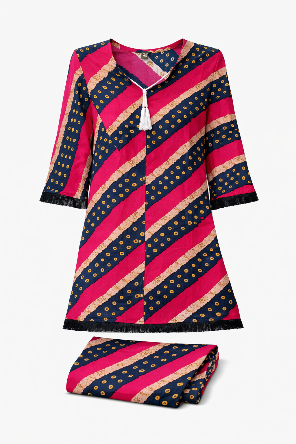 এই সেটটি তৈরি করা হয়েছে উন্নতমানের চায়না লিলেন কাপড় দিয়ে, যা গরমে ঘাম কমায় ও সারাদিন আরাম দেয়। ছবিতে দেখা বোল্ড মাল্টি-কালার প্রিন্ট পোশাকটিকে করেছে আলাদা ও নজরকাড়া। গলায় টারসেল ডিটেইল এবং হাতা ও নিচে লেইস কাজ এটিকে দিয়েছে প্রিমিয়াম লুক। প্লাজু কাট সেলোয়ার হাঁটাচলায় বাড়তি স্বাচ্ছন্দ্য দেয়—ডেইলি, অফিস বা ক্যাজুয়াল আউটিং সবকিছুর জন্য পারফেক্ট।